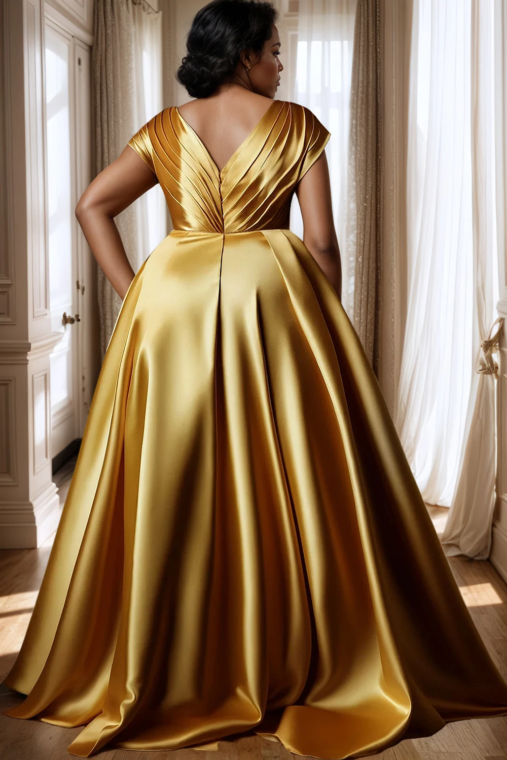 Designed for elegance and comfort, this evening dress features a flattering V-neckline and a backless detail that adds a touch of sophistication. The pleated A-line silhouette gracefully drapes to create a flowing maxi length, enhancing your natural curves while providing ease of movement. Perfect for formal occasions, this dress combines stylish design with a polished finish for a confident, refined appearance.