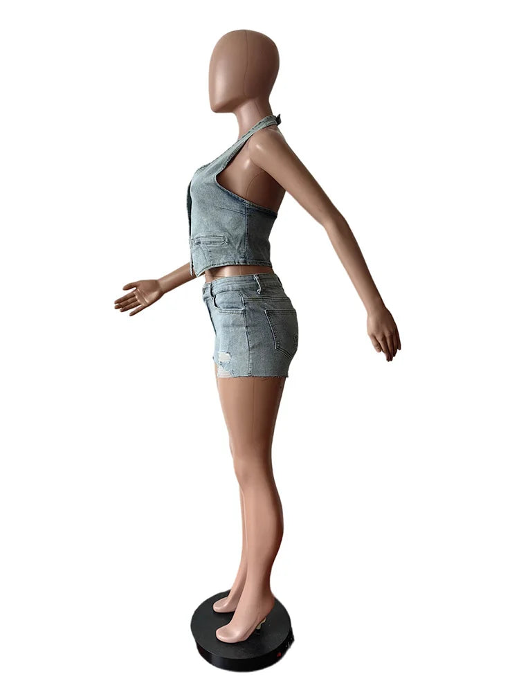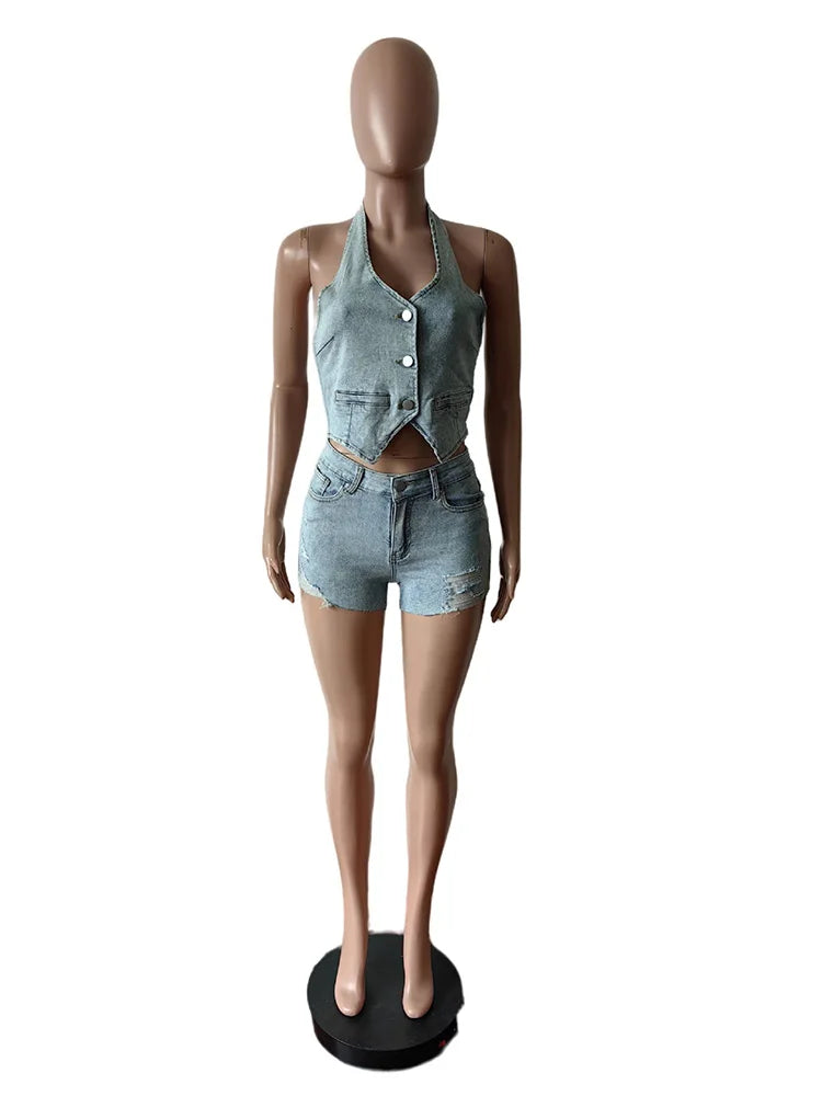 Achieve a cute and sexy look with the FZ Women's Single Breasted Backless Ripped Two Piece Denim Shorts Suit.