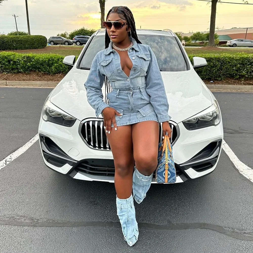 Stay stylish and sexy in our FZ Women's Single Breasted Turn-down Collar Denim Dress.