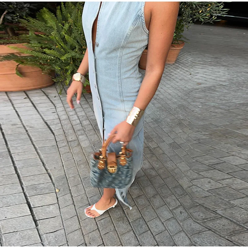 This FZ Women's Sleeveless Slim Fit Lapel Maxi Denim Dress offers both style and comfort.