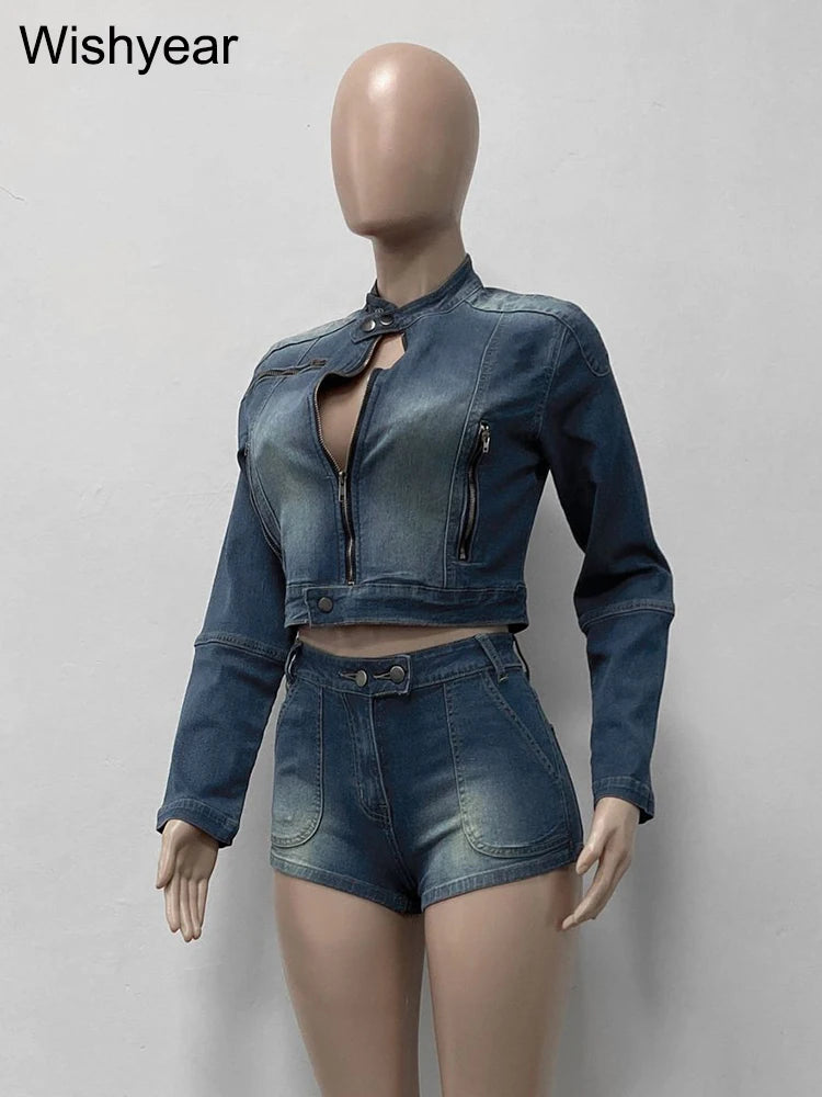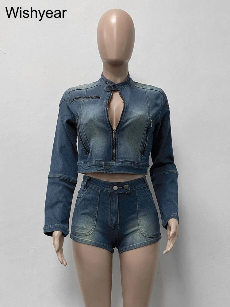 FZ Women's Streetwear stretch O-Neck Long Sleeve 2 Piece Denim Shorts Suit