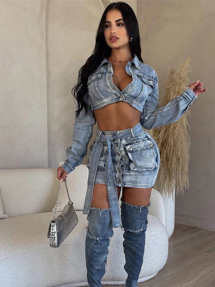 This FZ Women's Distressed 2Piece Single-Breasted Denim Skirt Suit combines a cute and sexy style for a versatile look. The distressed denim adds a touch of edge, while the single-breasted design adds sophistication. Perfect for any occasion.