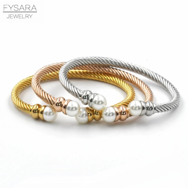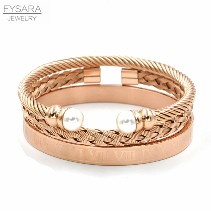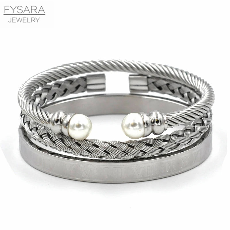 Upgrade your style with our FZ 3pcs/Set Charm Pearl Cuff Roman Wire Twist Cuff Bracelets.
