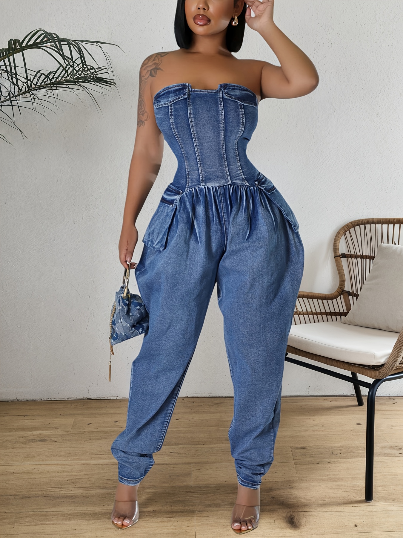 Crafted from durable material, this denim jumpsuit strapless design features functional cargo pockets for effortless style and practicality. Its sleek silhouette combined with utilitarian details offers a modern, fashion-forward look perfect for confident, versatile wear.