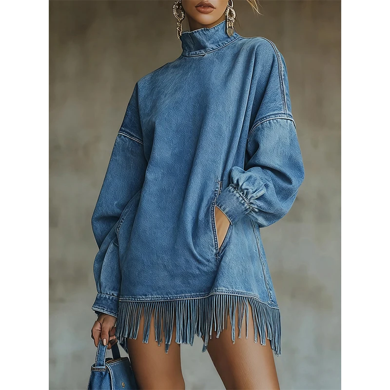 FZ Women's Half High Collar Tassel Hem Loose Sweatshirt Vintage Denim Dress