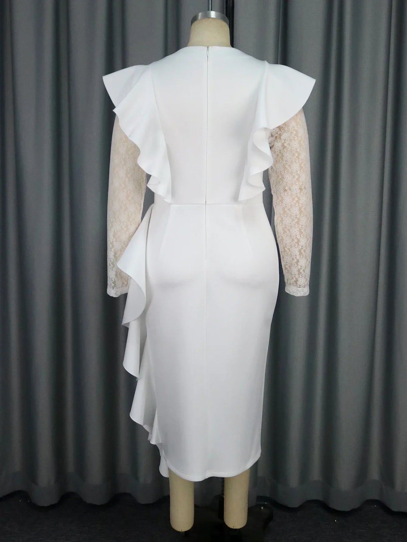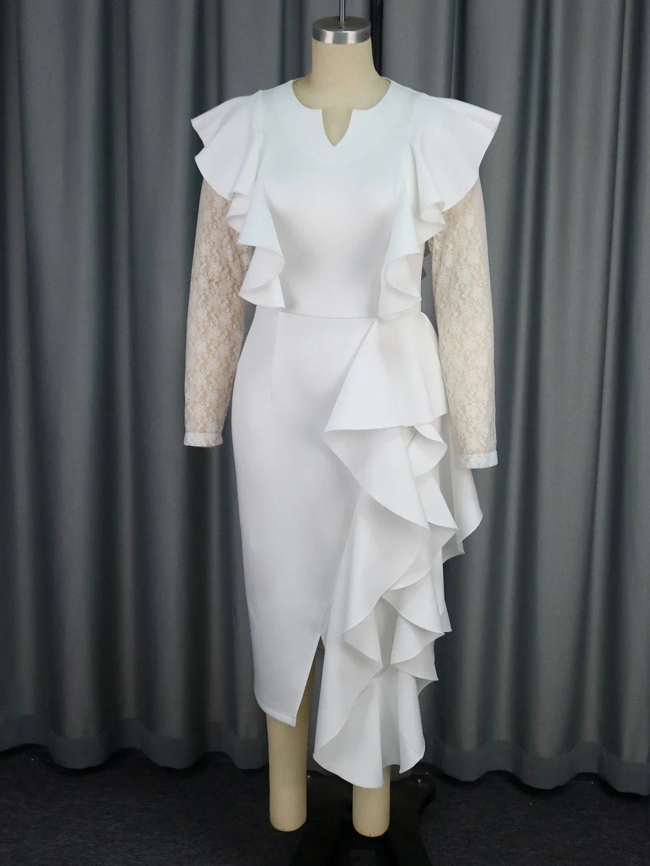 FZ Women's Lace Knit Long Sleeve Ruffle Trim Evening Dress