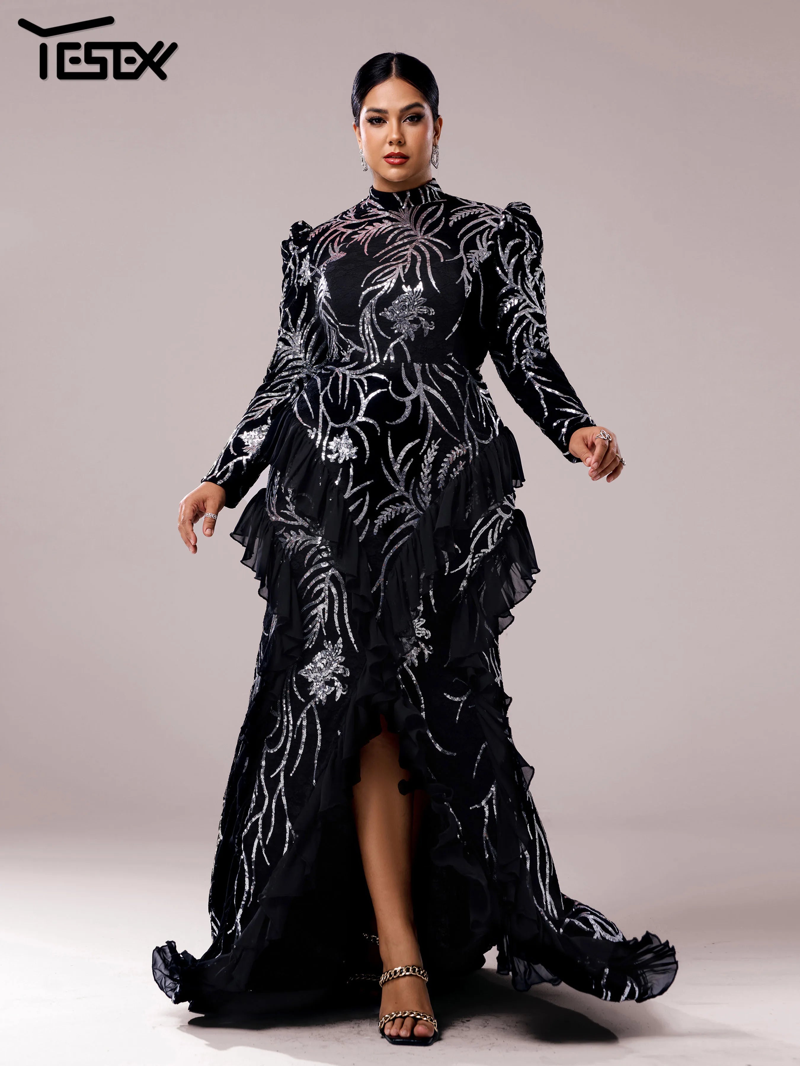 The round neck and long sleeves of this evening dress offers a flattering and classic look, while the split design adds a touch of modernity. Perfect for any evening occasion, this dress is a must-have for any fashion-forward plus size woman.