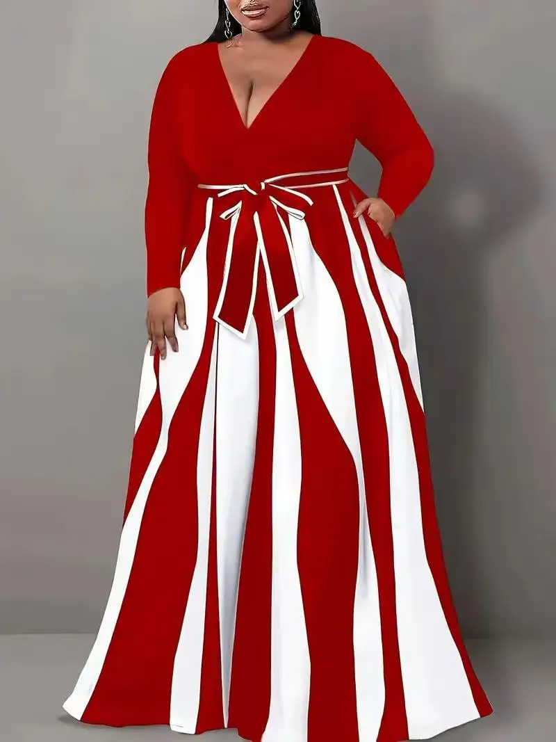 FZ Women's Plus-Size V-neck long-sleeved striped color-block dress