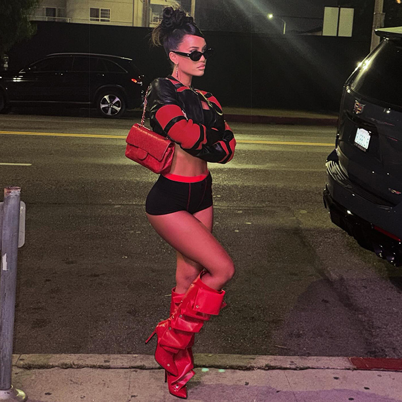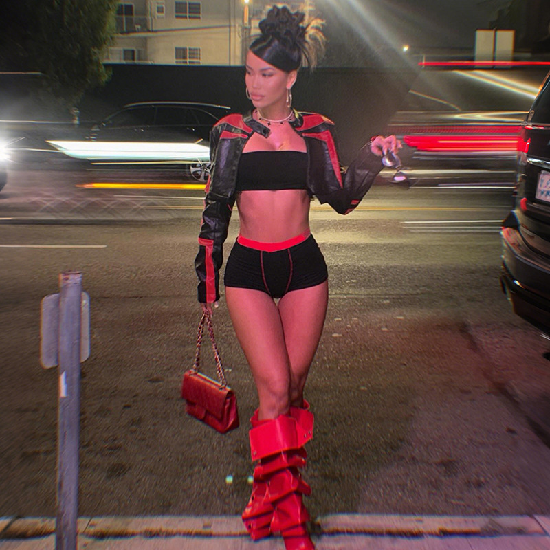 FZ Women's Slim Fit Contrast Colors Cropped Leather Zipper Jacket
