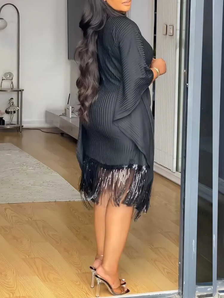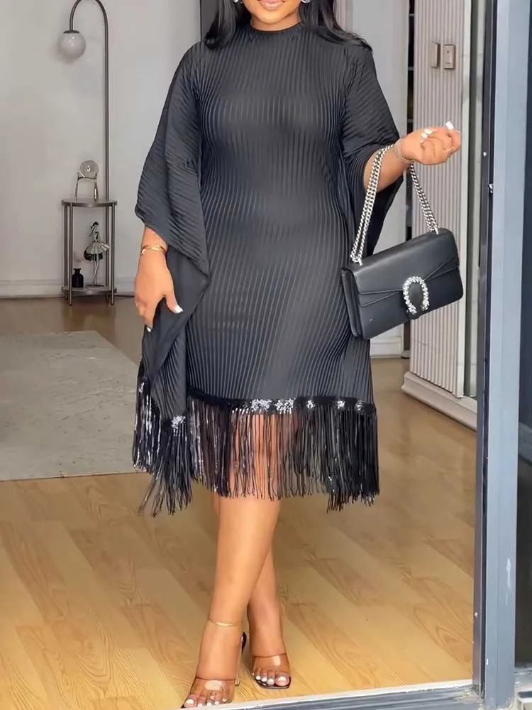 Elevate your wardrobe with this sophisticated French-inspired knitted dress, featuring graceful batwing sleeves and delicate tassel sequin detailing.