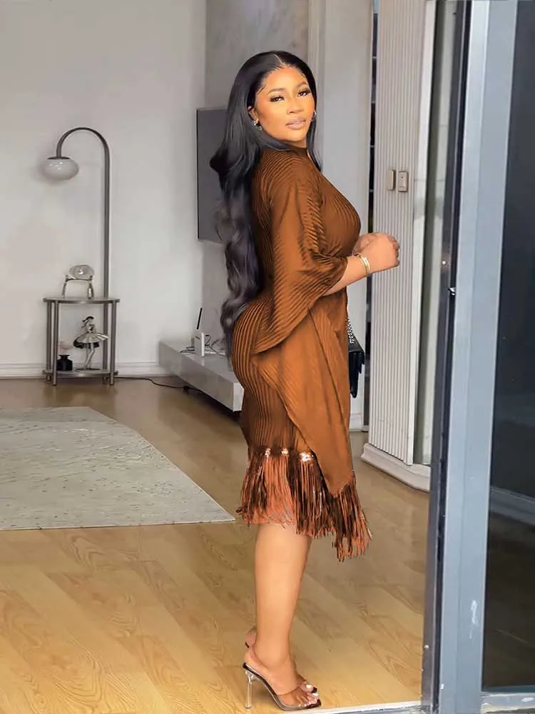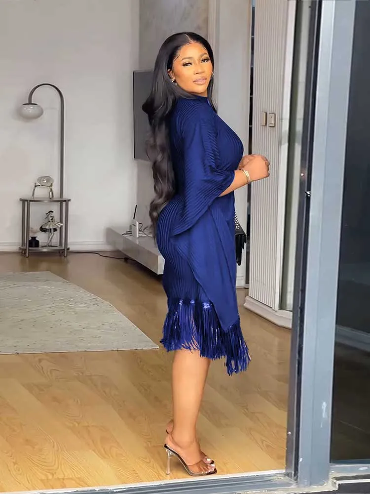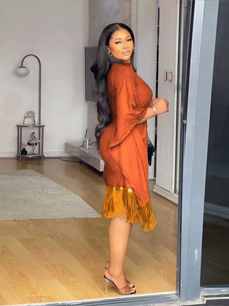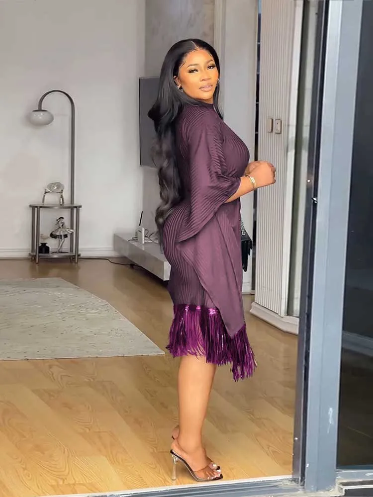 Beautiful Ladies Autumn Dresses Tassel Sequin Party Dresses High Quality Stretchy Batwing Sleeves French Style Knitted Dress