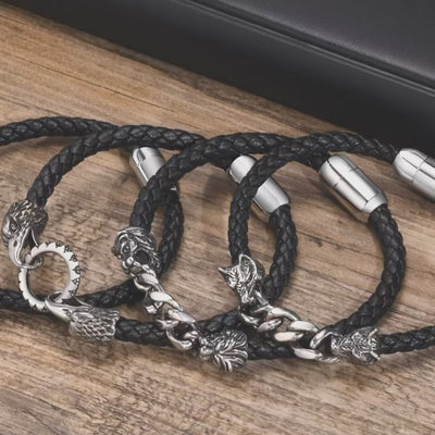 FZ Gothic Double Wolf Heads Braided Rope Chain Stainless Steel Bracelet