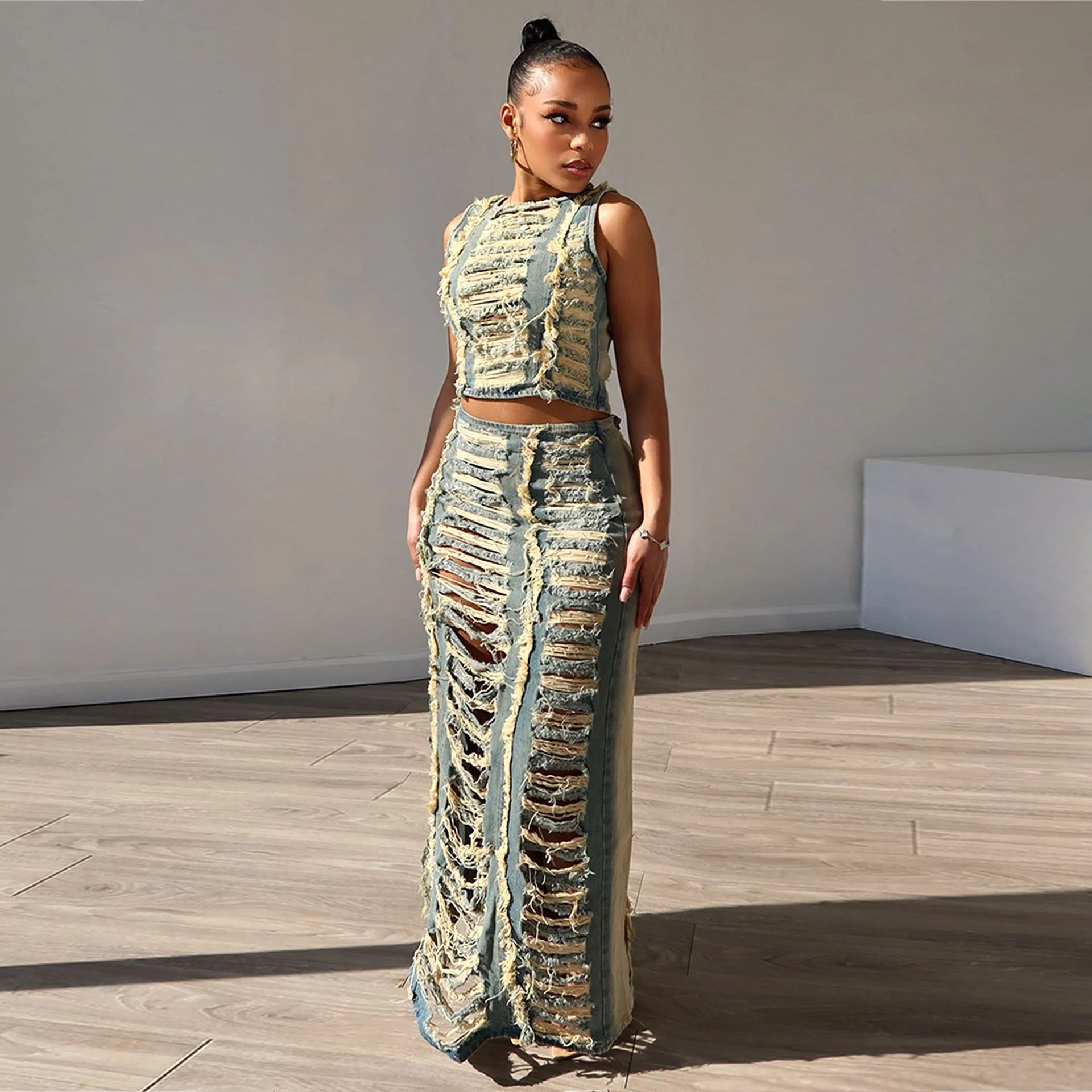 FZ Women's Elegant Ripped Hole Two 2 Piece Split Side Maxi Denim Skirt Suit Sale price€58,95