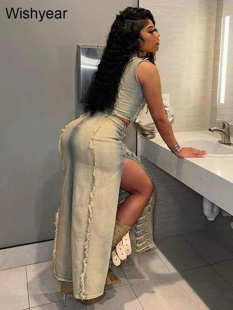 Introducing the FZ Women's Elegant Ripped Hole Denim Two 2 Piece Split Side Maxi Skirt Suit. This suit combines the cuteness of a skirt with the sexiness of ripped holes. Perfect for making a statement, the two-piece design and split sides add a touch of elegance to your wardrobe.