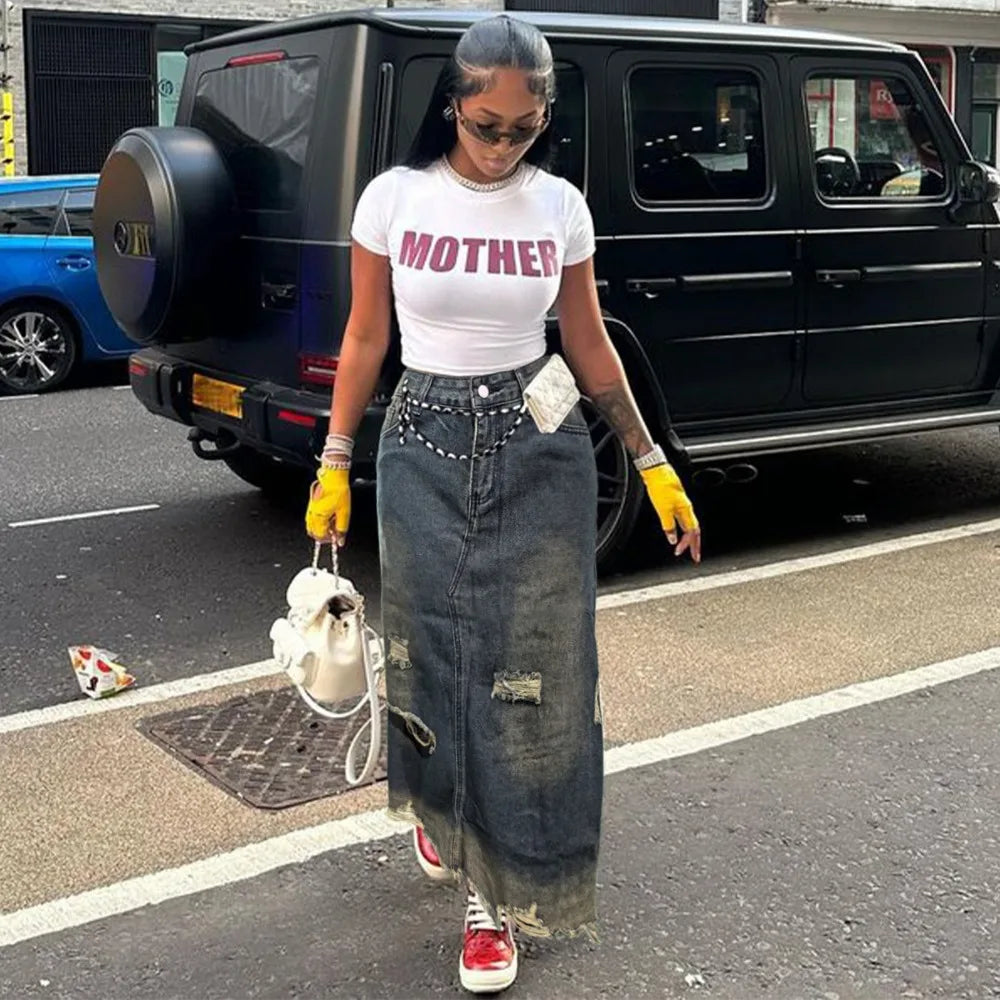 Made from high-quality denim, this denim skirt features a stylish button hole design and flattering high waist. The distressed details add a cute vintage touch to any outfit. Perfect for any occasion, this skirt is a must-have for every fashion-forward woman.