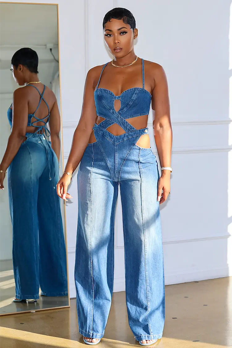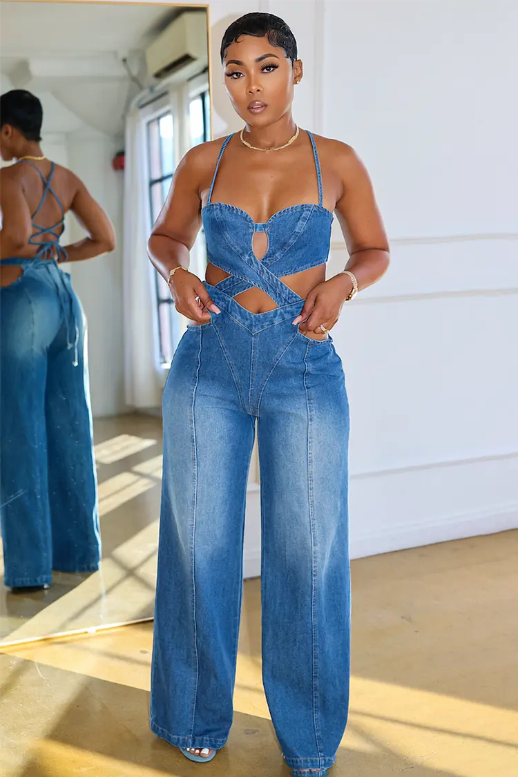The cross back design and cutout details of this denim jumpsuit adds a touch of allure, while the quilted denim material offers both comfort and durability. Elevate your wardrobe with this stylish jumpsuit.