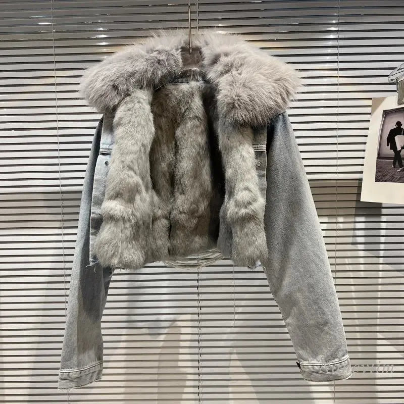 FZ's Fried Street Style Fur Collar + Fur Liner Rivet Short Denim Jacket is a must-have for any stylish woman.