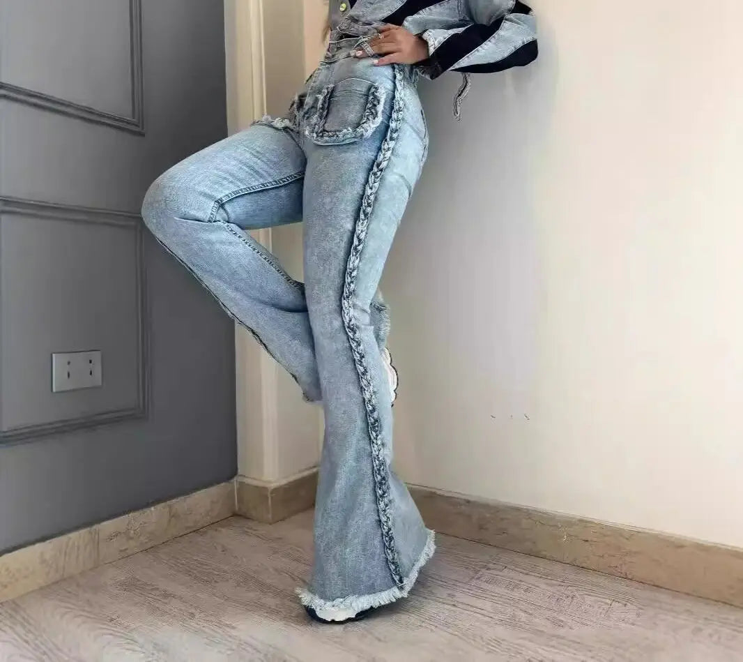 These stylish yet sexy denim pants are perfect for any occasion. The high waist design flatters your figure while the flare legs add a trendy touch. Elevate your wardrobe with these denim pants that will make you feel confident and fashionable.