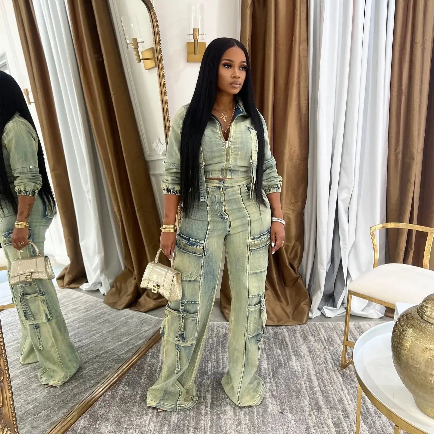 The FZ Women's Multi Pockets Cargo Denim Pants Suit offers stylish fashion with its versatile design.