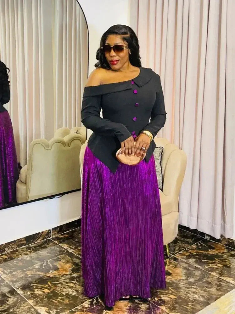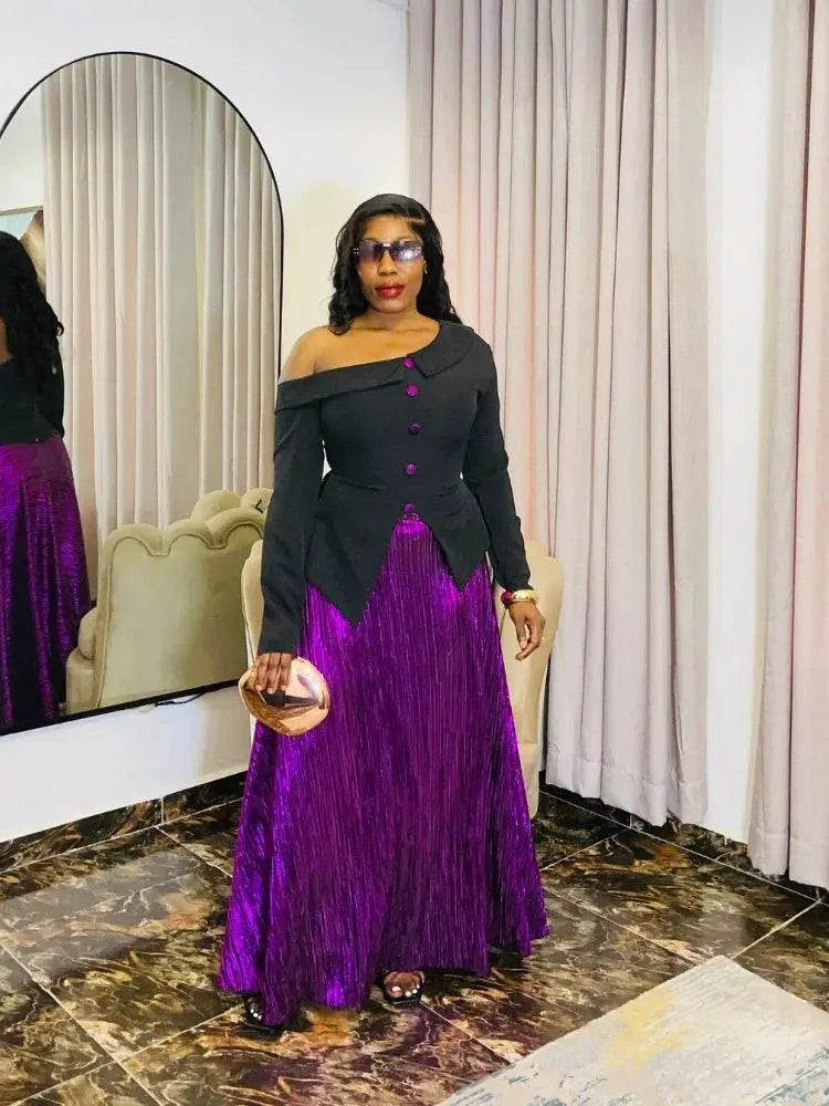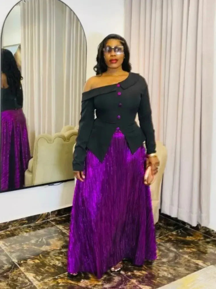 This elegant fashion skirt suit exudes sophistication and versatility, making it perfect for any occasion. Let the off shoulder design and flowy silhouette accentuate your feminine curves and embrace the timeless beauty of this suit.