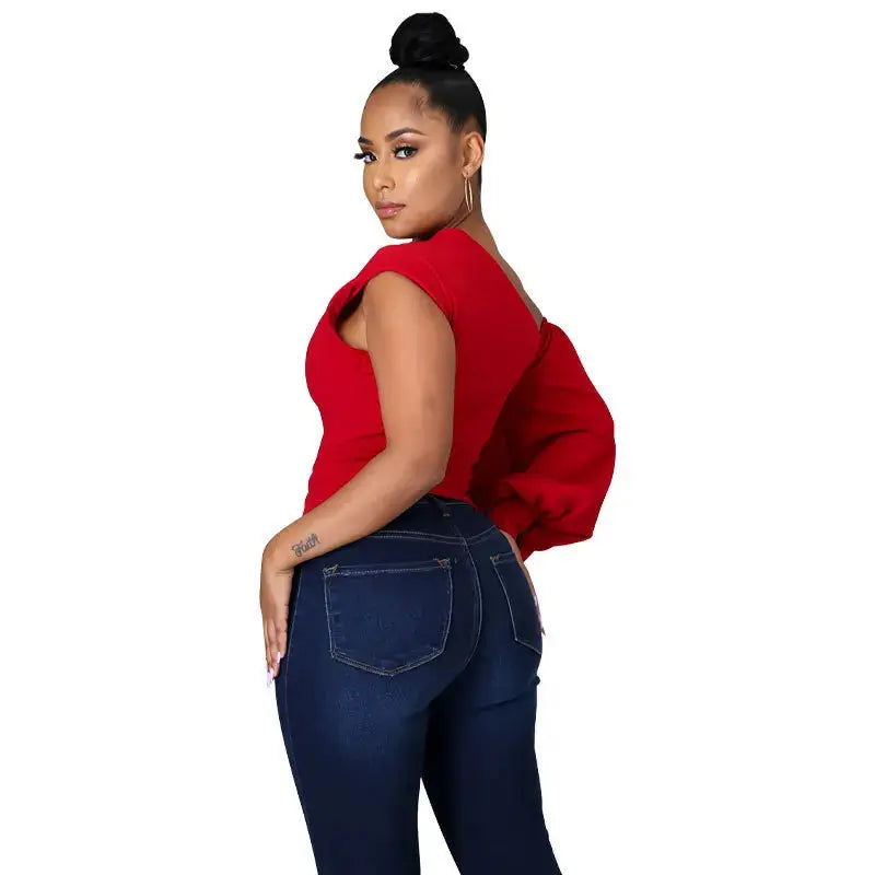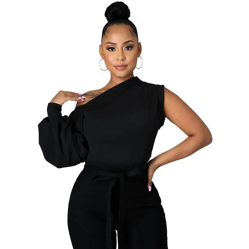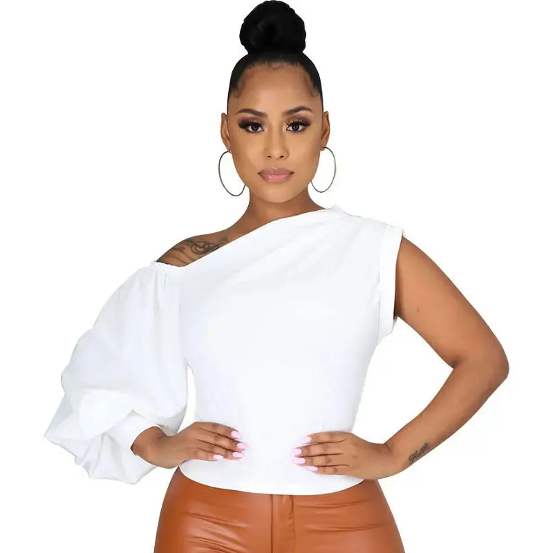 FZ Women's One Shoulder One Long Lantern Sleeve Skew Neck Street Top