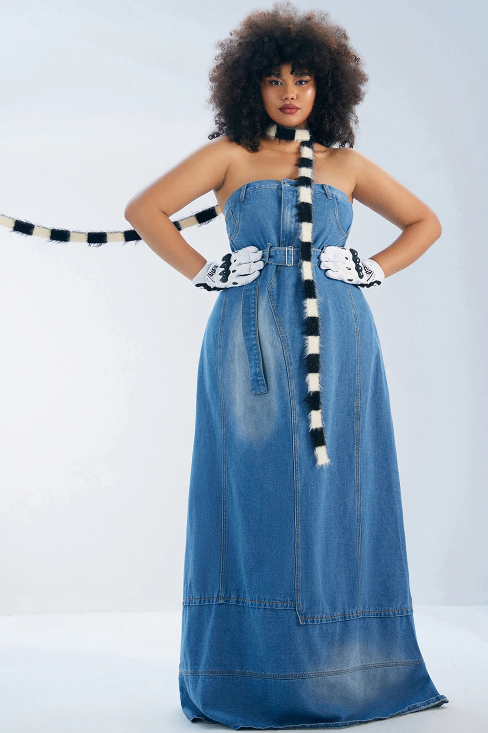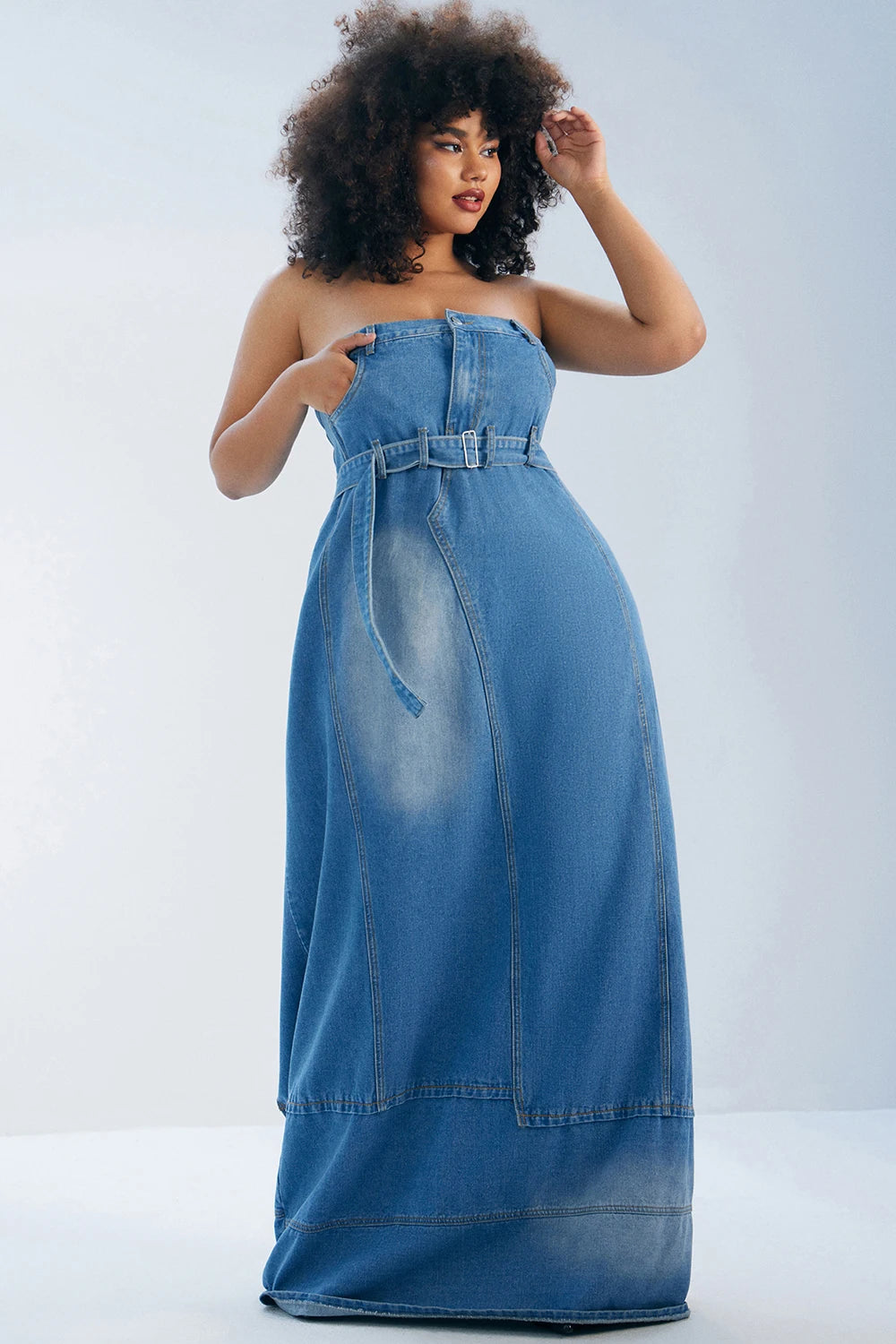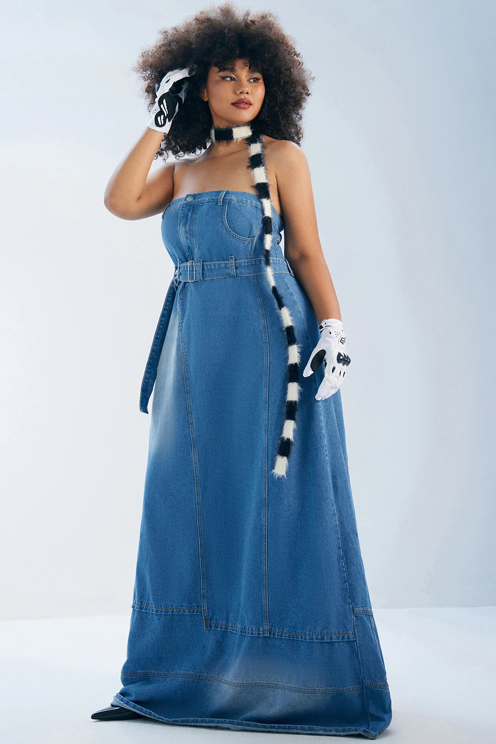 This plus size strapless denim dress exudes casual style with its vintage high street design.