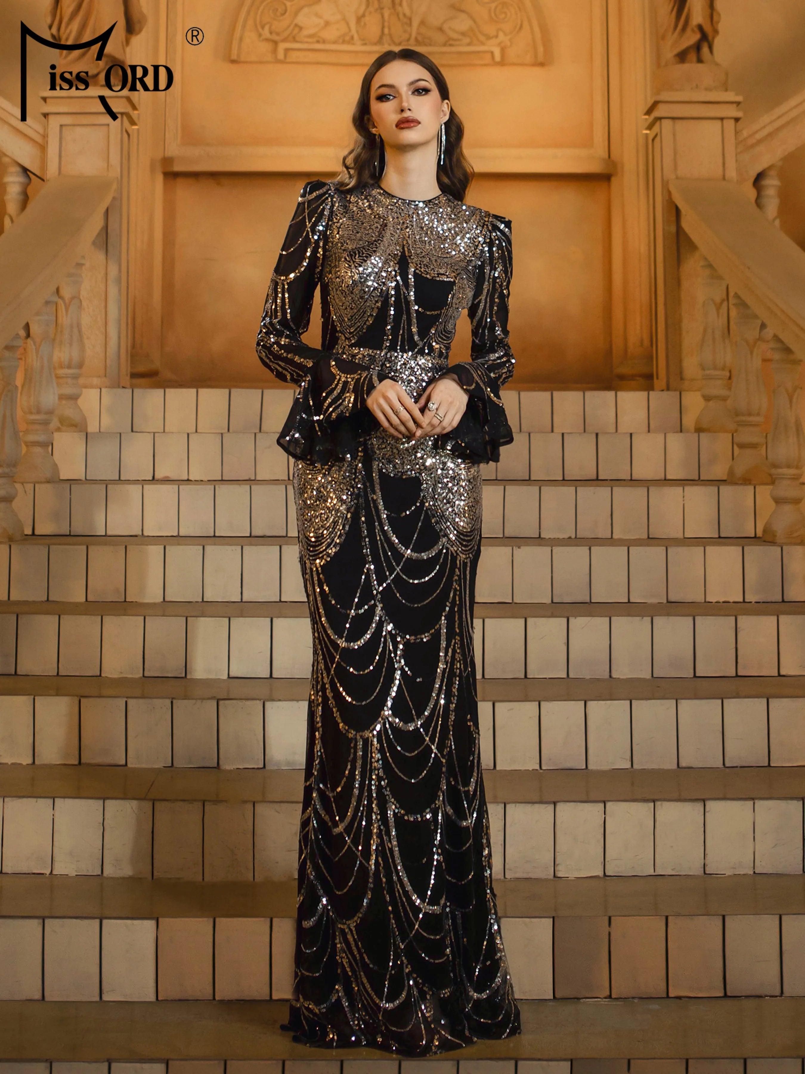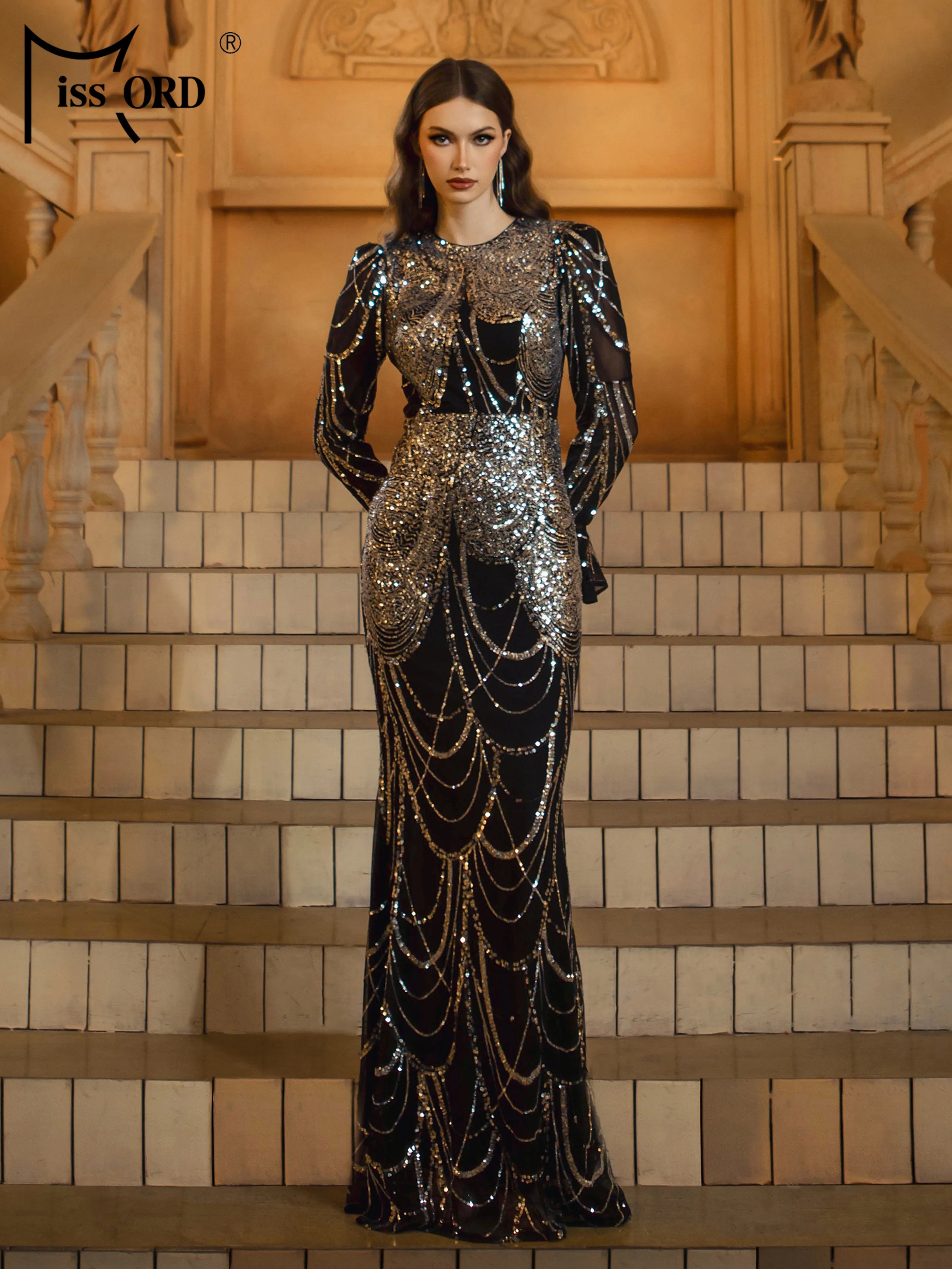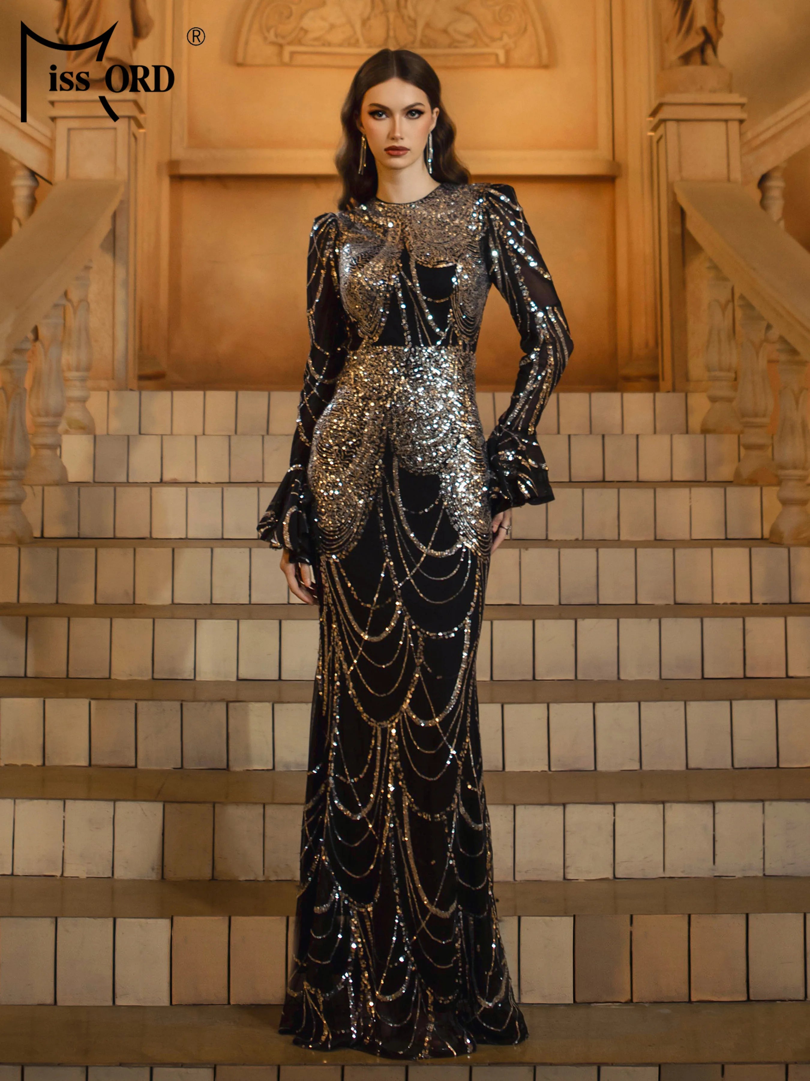 This elegant and stylish evening dress features a flattering round neckline and mesmerizing sequin detailing. Perfect for any special occasion, you'll be sure to make a statement in this eye-catching dress.