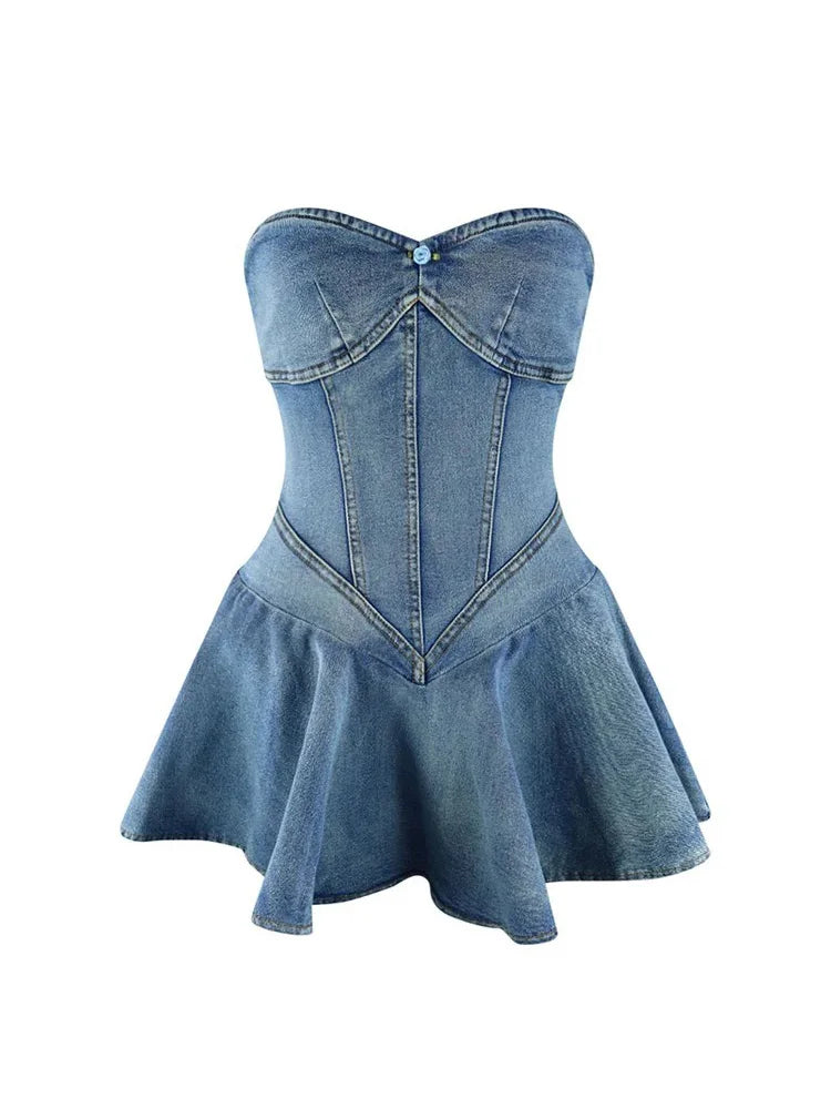 Elevate your style with our FZ Women's Sexy Tube Backless Ruffle Hem Slim Mini Denim Dress.
