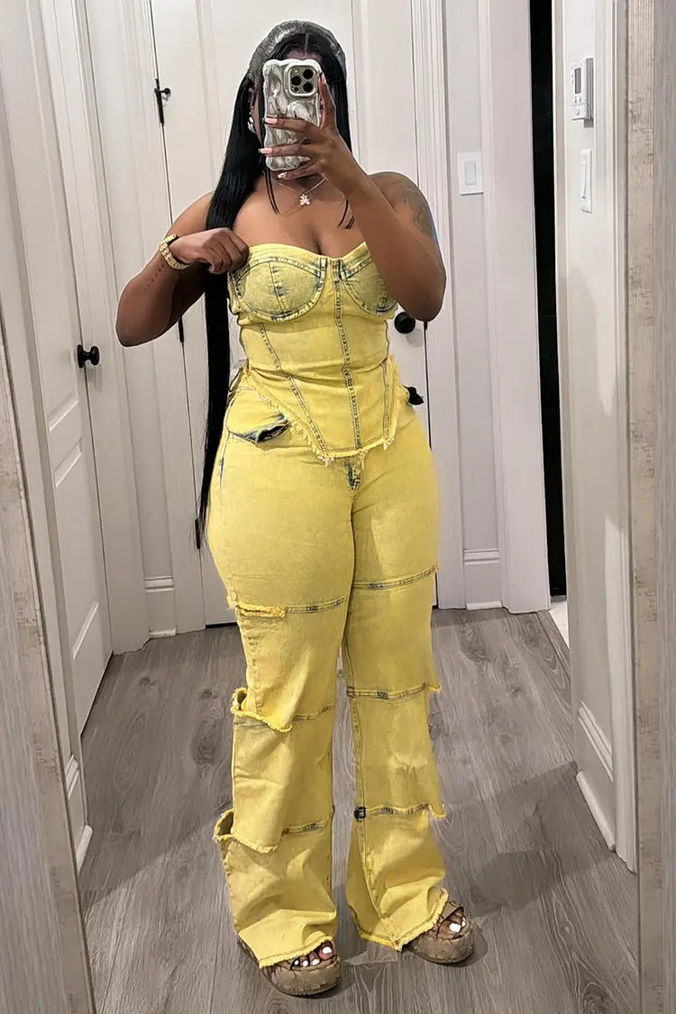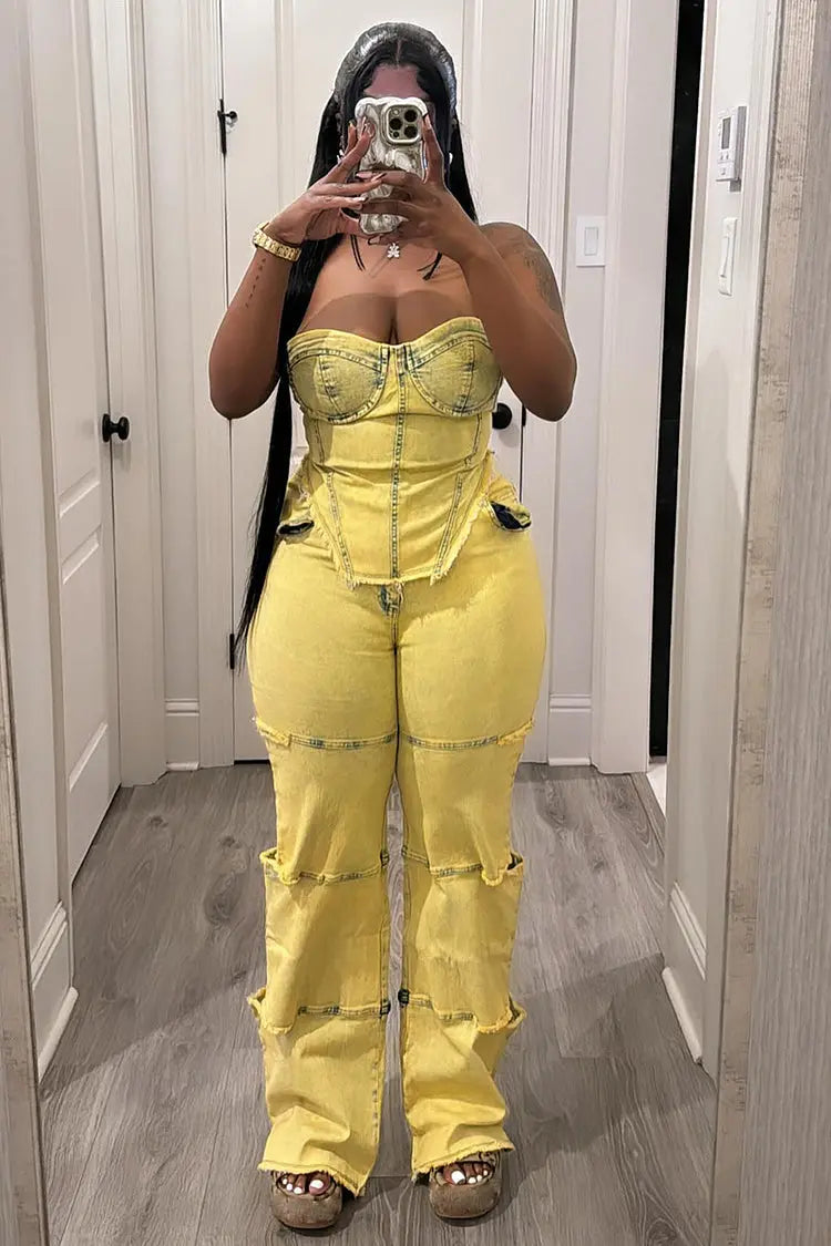 Expertly designed for bold, confident women, the FZ Women's Strapless Irregular Top Cutout Denim Pants Suit exudes style and sexiness.