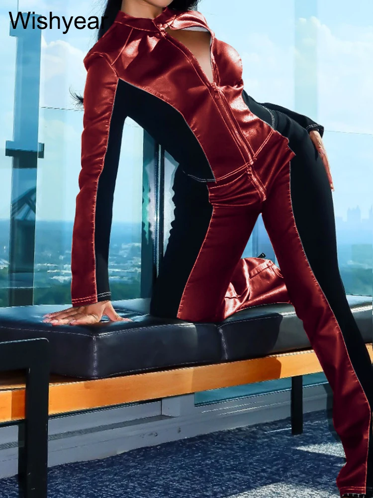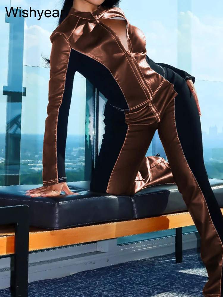 This expertly crafted pants suit features premium stretch PU leather that moves with you, delivering both durability and comfort. The flared silhouette creates a striking visual impact while the moto-inspired design adds an authoritative street aesthetic. Perfect for those who demand versatility—wear the pieces together for a bold statement or separately to elevate everyday looks. The structured fit flatters while the quality construction ensures lasting wear through seasons of style.