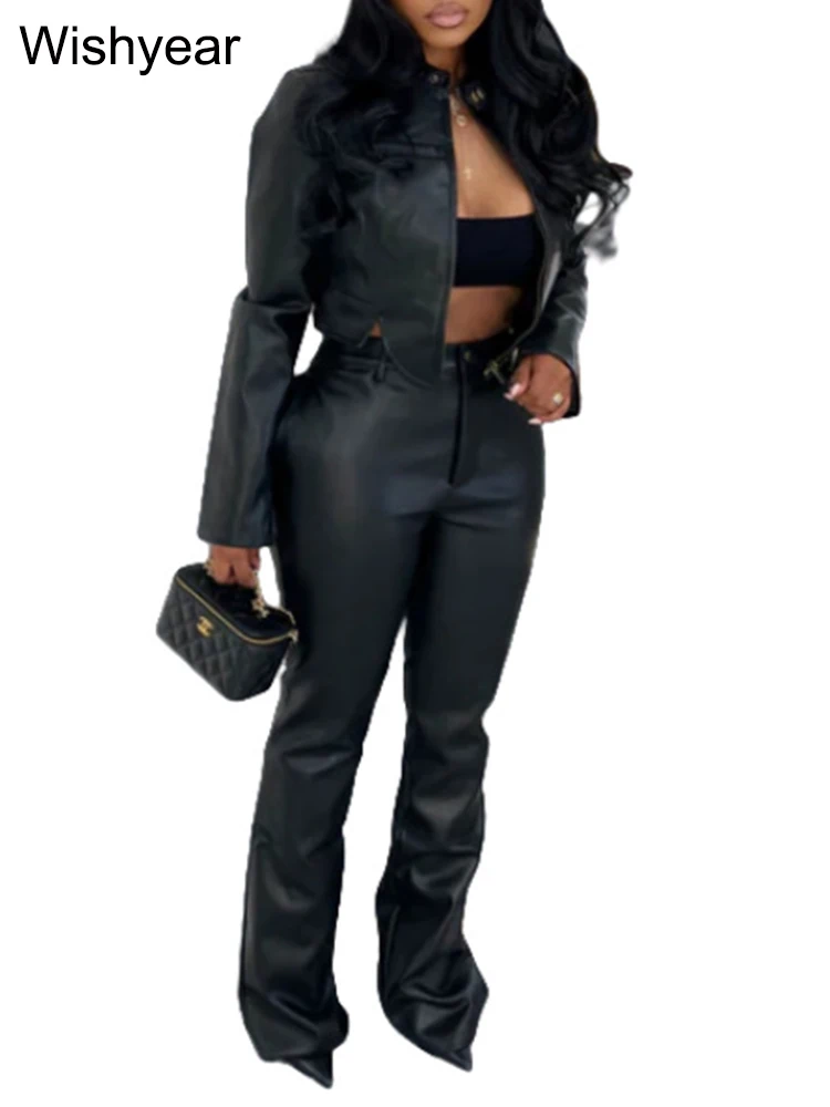 FZ Women's Stretch PU Leather 2 Pieces Long Sleeves Zipper Pants Suit combines contemporary edge with refined sophistication.