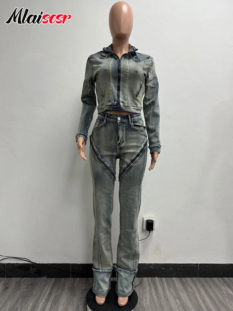 FZ Women's Stretch Straight Cargo High Street Two Pieces Denim Pants Suit