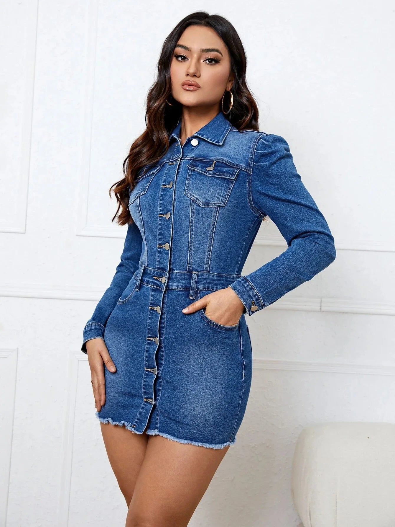 Featuring a turn down collar and a flattering mini skater silhouette, this denim dress is perfect for any occasion. The cute and sexy design makes it a must-have for fashion-forward women.