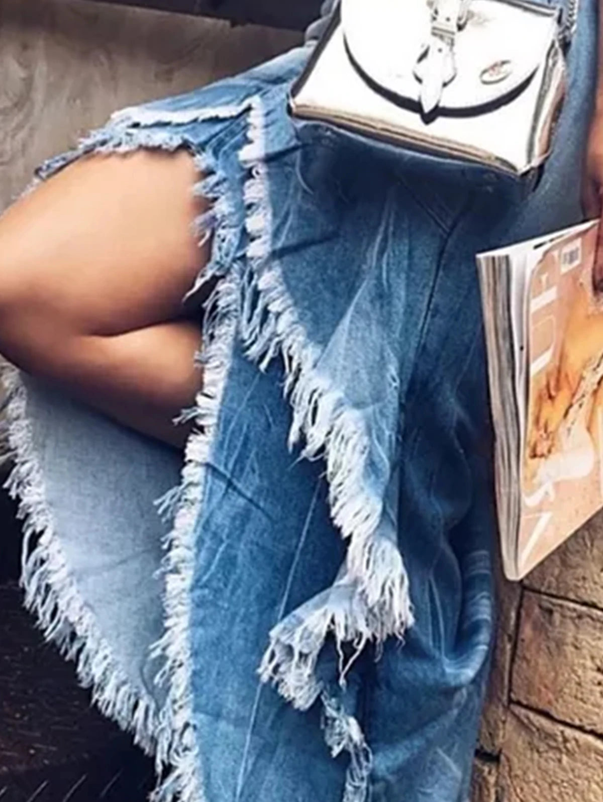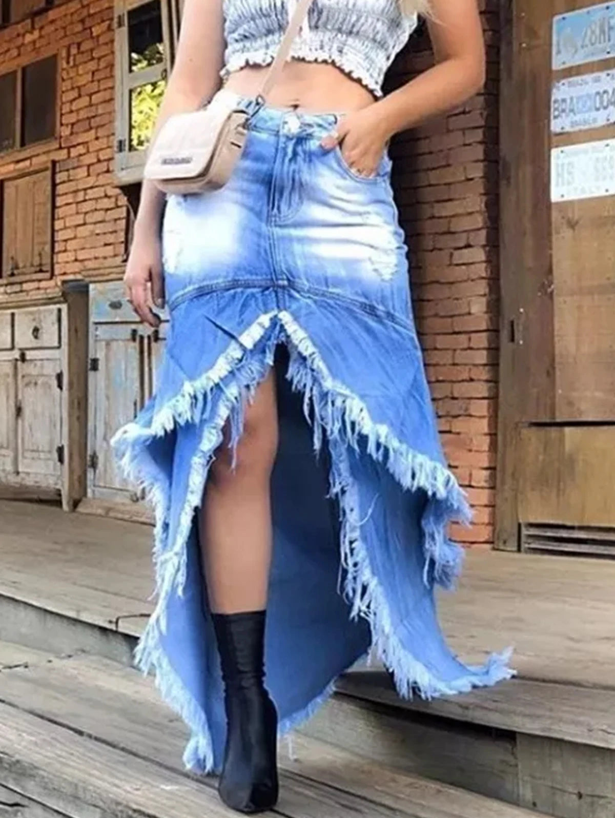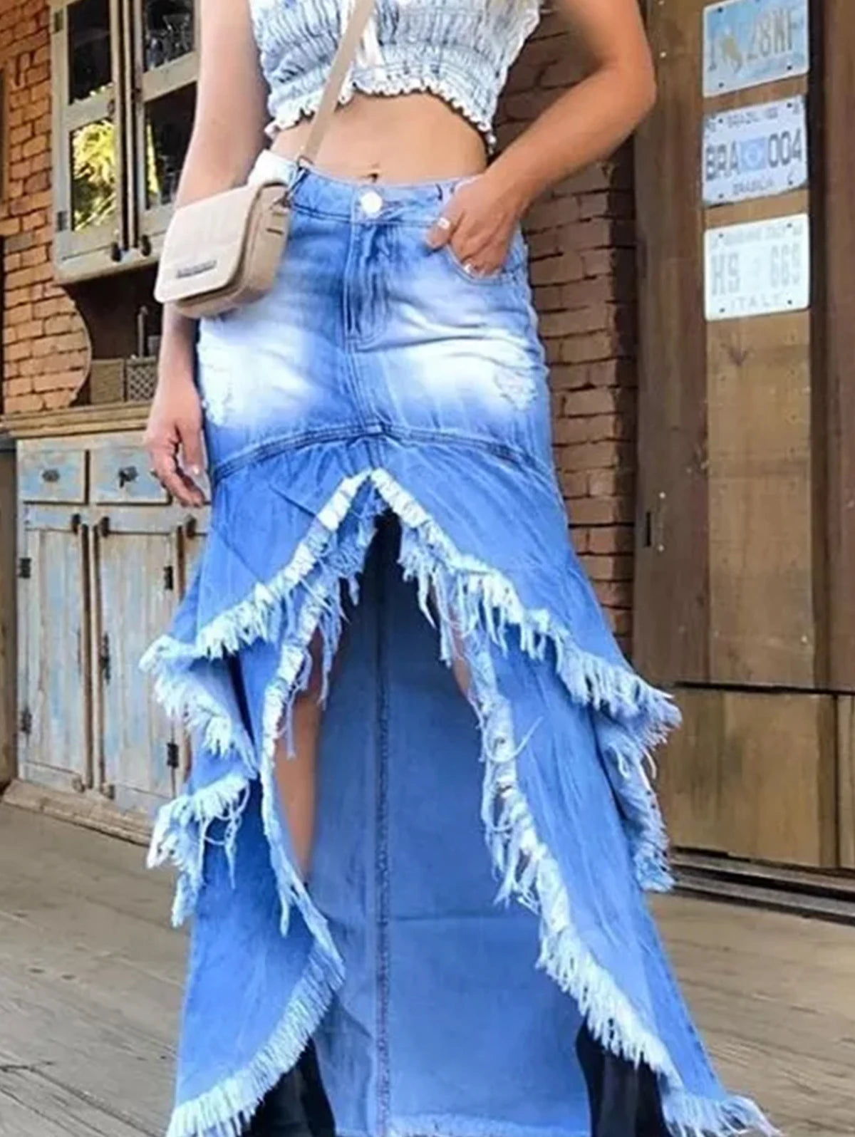 FZ Women's Maxi Front Slit Plain Raw Trim Slim Fit Denim Skirt