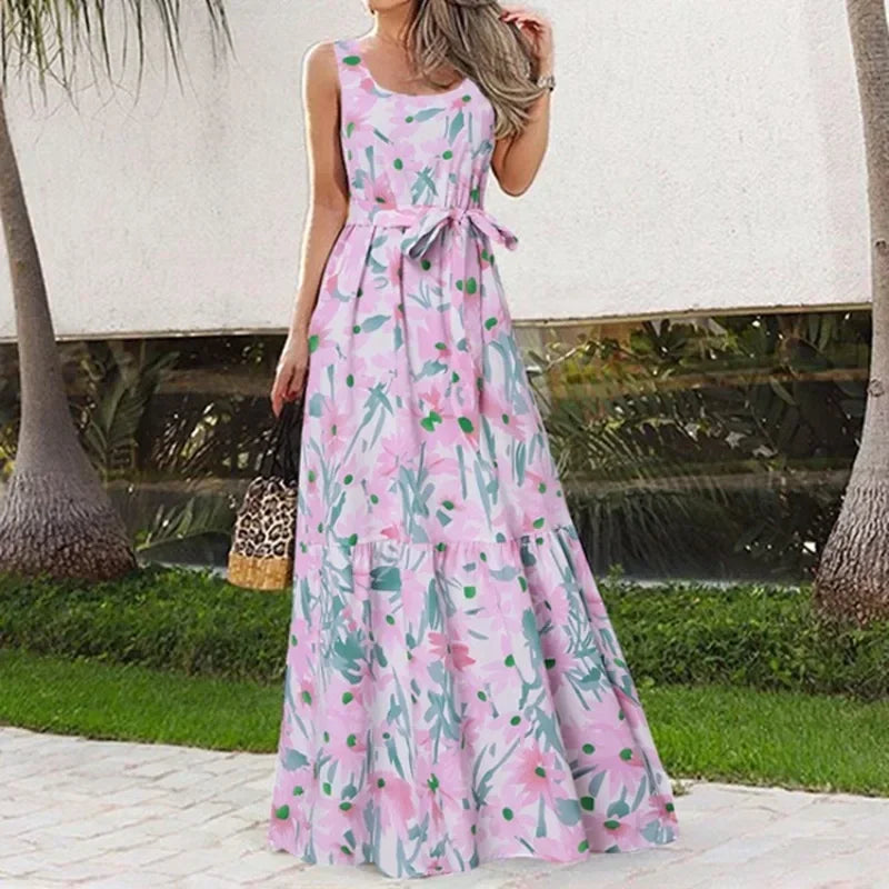 FZ Women's Elegant Square Neck Sleeveless Printed Floor-Length Sun Dress