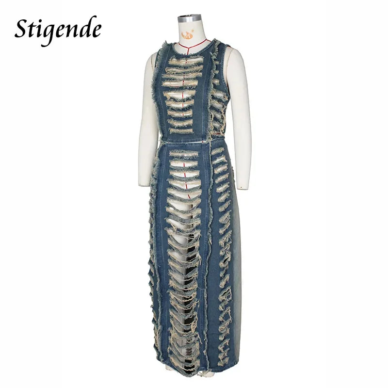 The ripped holes of this denim skirt suit add a touch of edginess, while the high split and hollow out design bring a sexy and alluring vibe. Perfect for those looking to make a statement with their fashion choices.